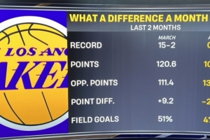 三月湖人的战绩是15胜2负,场均得到120.6分,失分111.4,净胜分+9.2,命中率51%;