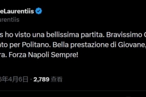 体育资讯4月7日讯 在那不勒斯1-0击败米兰夺回意甲第二名后,那不勒斯主席德劳伦蒂斯更新社交媒体。